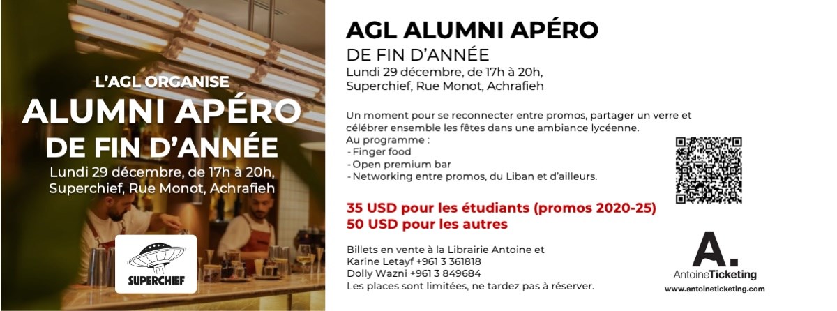 L’AGL organise l’Alumni Apéro de fin d’Année le lundi 29 décembre, de 17h à 20h, au Superchief, Rue Monot, Achrafieh.